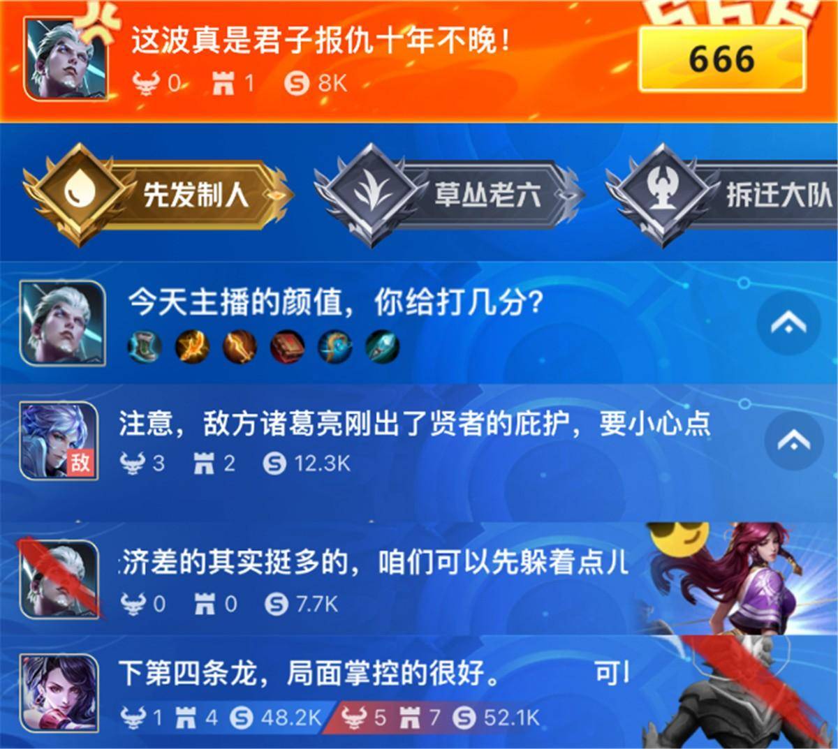 比如趣味播报功能,直播间会实时根据游戏中的动态来播报各种信息,包括主播当前装备、主播完成反杀或者秒杀操作,还有团队击杀了龙王、主宰等等,都会有对应的事件播报,让战局更加清晰明朗。而当主播在游戏中完成四杀、五杀甚至超神的操作时,直播间也会亮起对应的特色成就,酷炫的动画特效瞬间就让对局燃了起来。