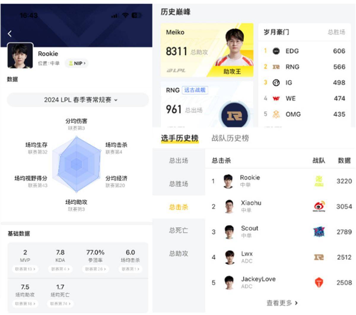 最直观的感受就是各种数据一应俱全,真的把选手和战队“扒”了个干净,比如英雄联盟版块里,你可以查询选手当前赛季和过往赛季的各项数据,还可以查看他在本赛段中的表现,究竟是“团队救星”还是“摸鱼达人”,数据一看就知真假。