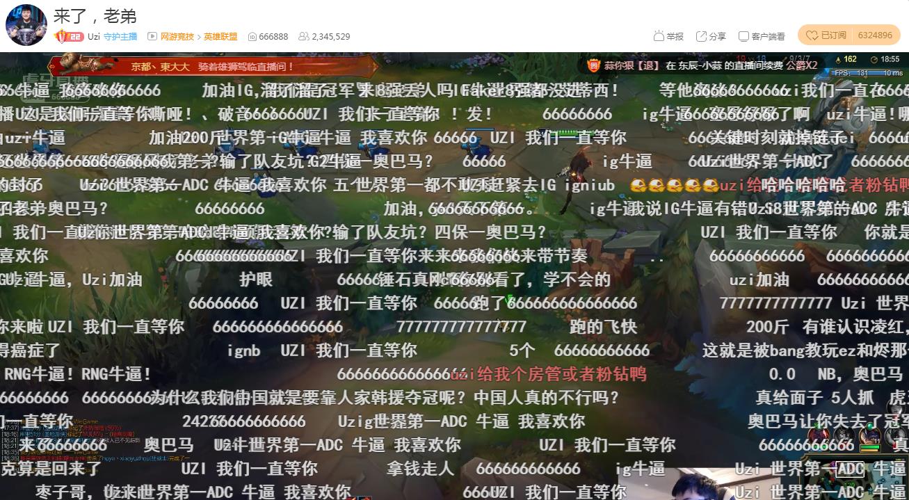 来看UZI直播的有粉丝也有黑子,开播不到一小时UZI的直播间人气已经到达240万,成为了网游区的第一,整整甩开第二名的青蛙三倍之多。