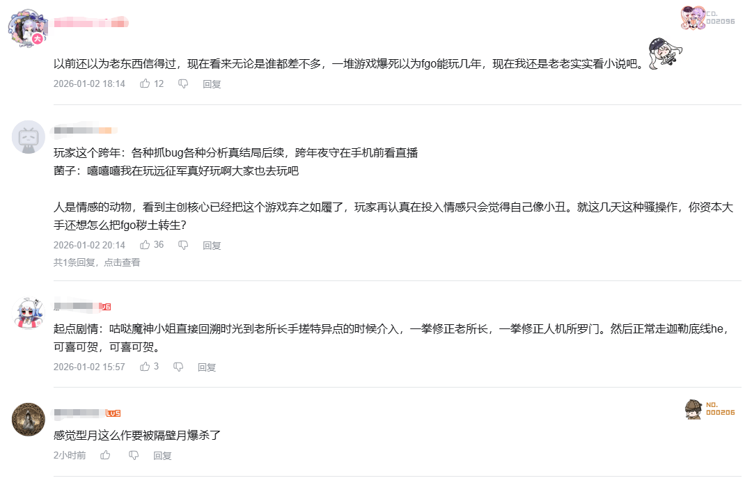 一石激起千层浪,原作者的“死刑宣告”,让那些投入十年心血,从序章一步步追到终章的玩家来说,这份宣告无疑太过沉重,不少人觉得自己的青春和付出都打了水漂。有人愤怒吐槽官方消耗情怀,有人沉浸在悲痛中难以释怀,也有人抱着一丝希望,期待这只是“技术性”调整,盼着索尼能出手保住这只常年盈利的金蛋。但无论如何,在FGO官方公布确切的2026年运营规划前,御主们的心情恐怕还要沉重好一段时间了。