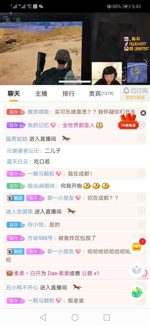NBA直播,足球直播,篮球直播,欧洲杯直播,lol直播,英雄联盟直播,dota2直播,dnf直播,cf直播,绝地求生直播,王者荣耀直播,游戏直播,赛事直播,YY直播,美女直播,视频直播,足球直播今天是6月25号,孤存又如约地来到了虎牙直播间,开启了直播。在今天的直播过程中,孤存开启了17淘汰吃鸡的模式,粉丝们在整个直播间更是欢声笑语一片,具体是怎么回事呢?请看下面粉丝们的互动情况。