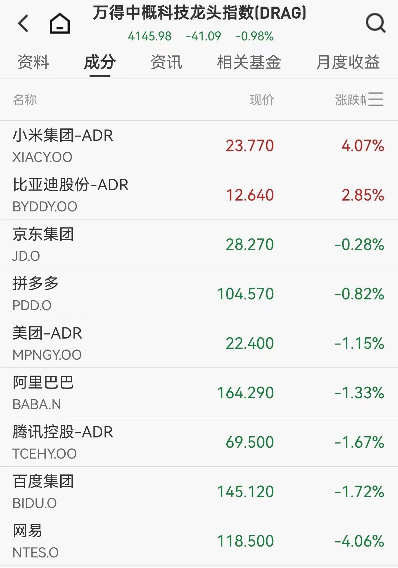 中概股多数走弱,纳斯达克中国金龙指数跌0.65%,网易跌超4%,虎牙、晶科能源跌超5%,百度、阿里巴巴分别跌1.72%、1.32%,拼多多、京东小幅下跌。不过部分中概股逆势走高,世纪互联涨超12%,金山云涨9.98%,哔哩哔哩涨2.84%,蔚来、小鹏、理想等造车新势力均涨超 1.6%,名创优品、华住集团等消费类标的也录得2% 以上的涨幅。