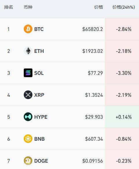 加密货币主要币种下跌,比特币跌近3%,报6.58万美元/枚,过去24小时全市场超11万人爆仓。