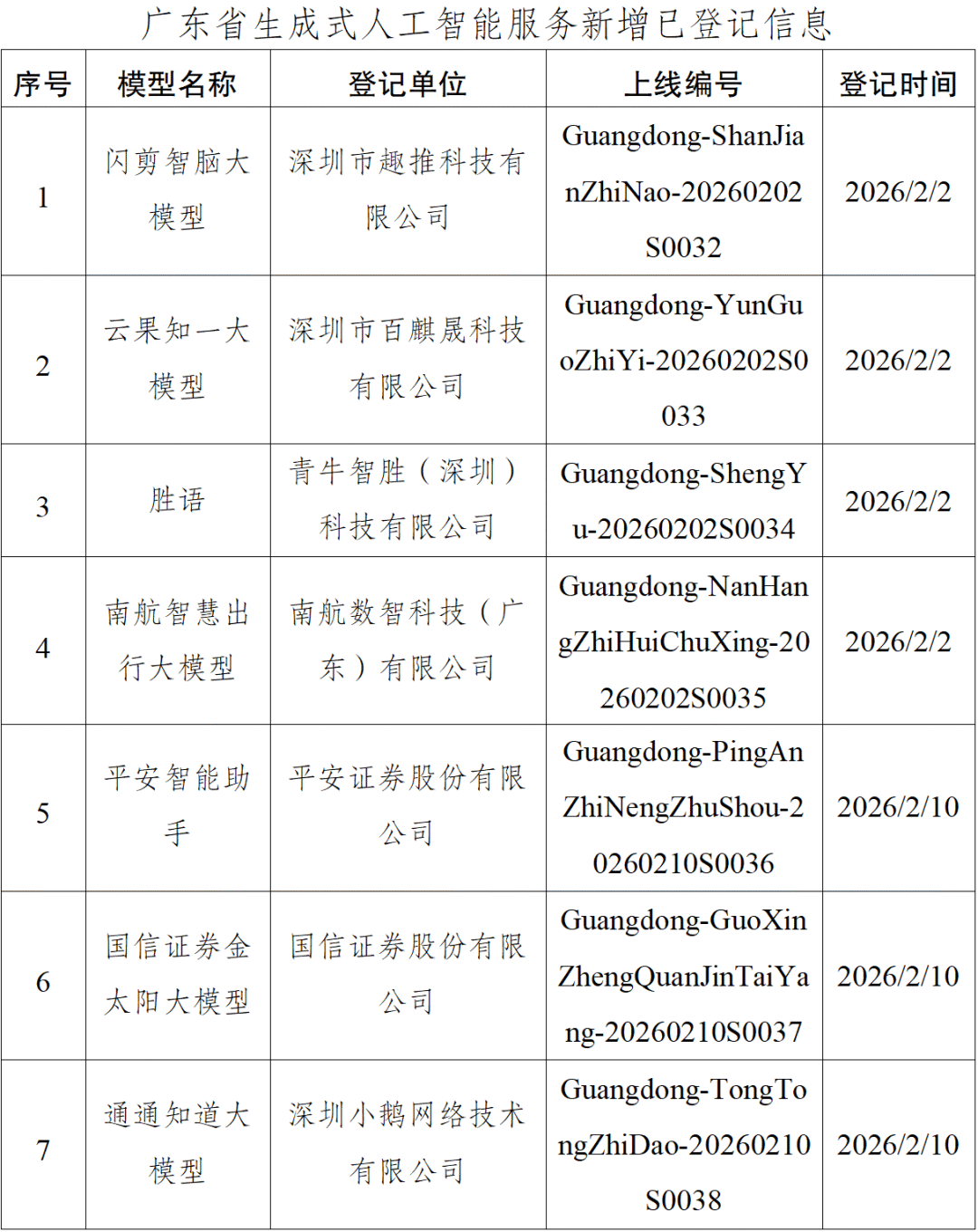■ 2月10日,广东省互联网信息办公室发布《广东省生成式人工智能服务已备案(登记)信息公告(2026年2月10日)》。据公告,截至2月10日,我省新增2款已完成备案的生成式人工智能服务,累计已完成124款生成式人工智能服务备案;新增7款已完成登记的生成式人工智能服务,累计已完成38款生成式人工智能服务登记。