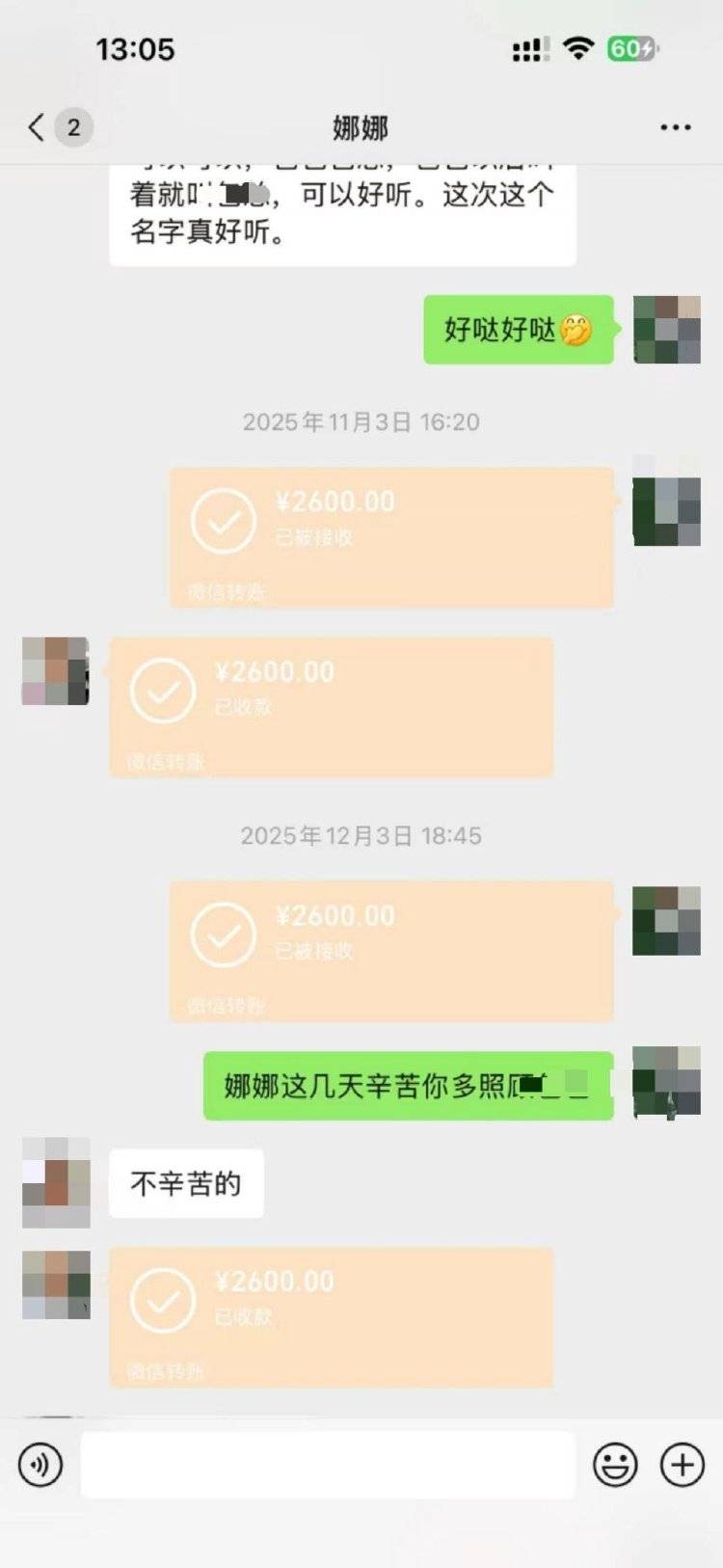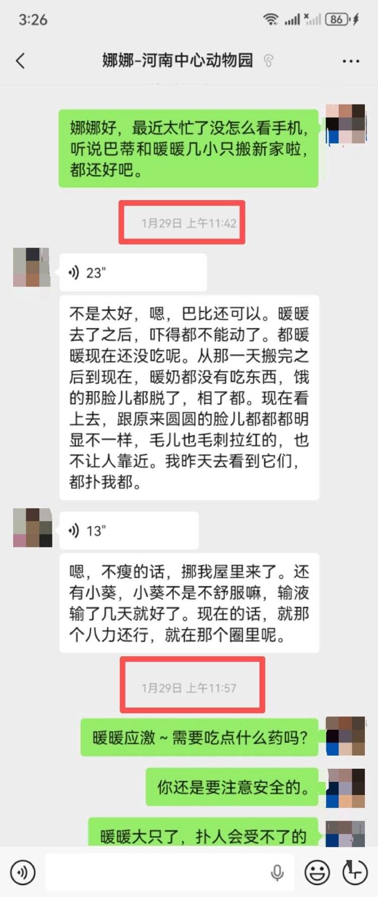 中午11时42分,娜娜用语音向其回复了几只小老虎的情况,并提到暖暖搬去新笼舍后受到了惊吓,一直没有吃东西,饿得脸脱相了,不让人靠近等等细节。辛女士回复:“这两小只,辛苦你了。”