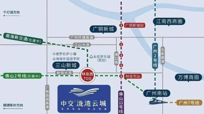 :项目最大的交通优势在于三轨双站,佛山地铁 2 号线与南海新交通(南海有轨电车 1 号线)在林岳西站交汇,业主下楼步行即可到达地铁站。搭乘地铁,2 站就能抵达广州南站,这里是华南地区重要的交通枢纽,方便前往全国各地;5 站可到达广钢新城,进一步加强与广州核心区域的联系。此外,在建的佛山 4 号线 号线站点也在附近,未来轨道交通将更加完善,居民出行选择更多,能更便捷地穿梭于广佛两地。